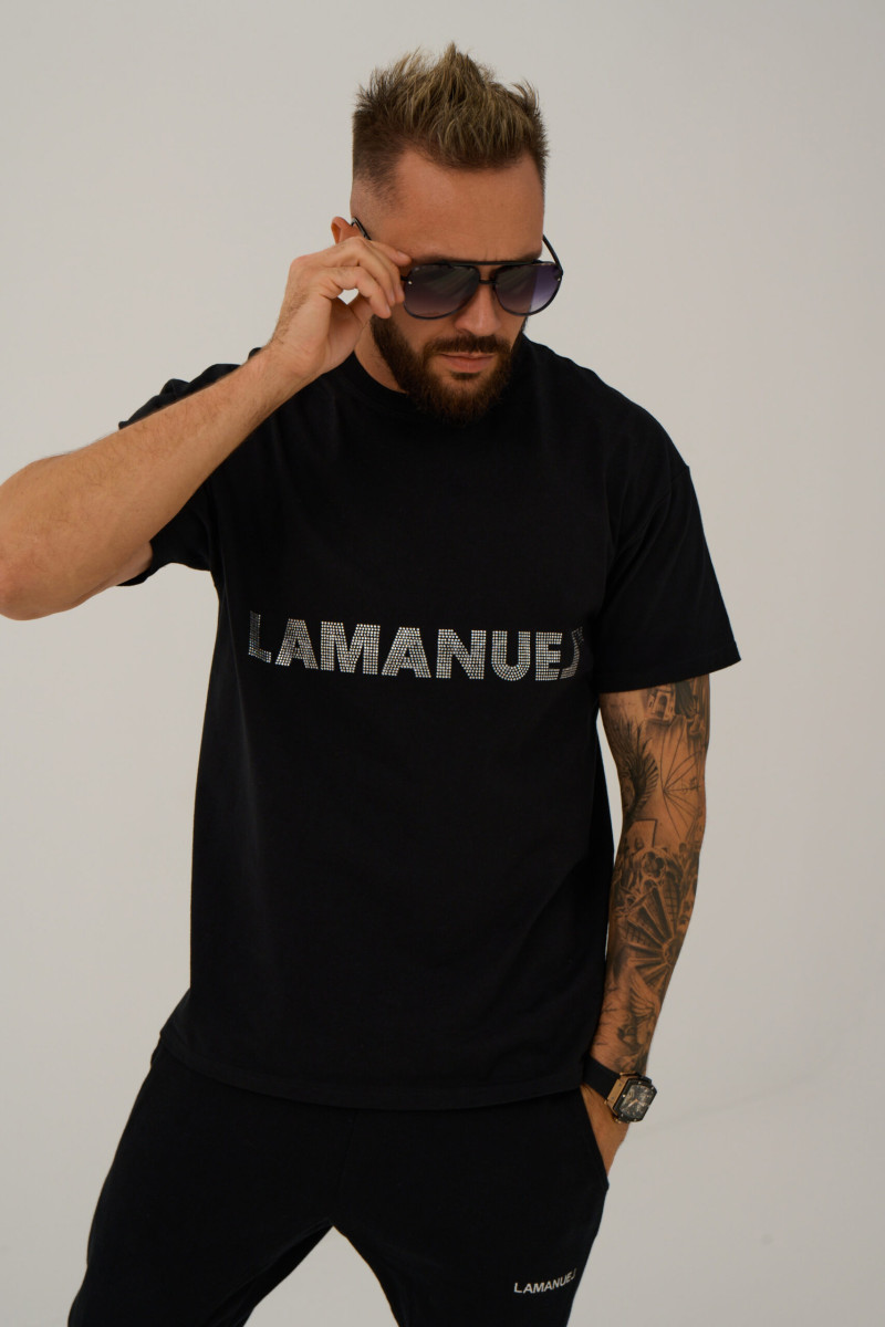 Czarna koszulka o swobodnym fasonie z charakterystycznym logiem marki „LAMANUEL TM” wykonanym z wysokiej jakości cekinów szlifowanych na klatce piersiowej. Wykonana z delikatnej polskiej bawełny.
