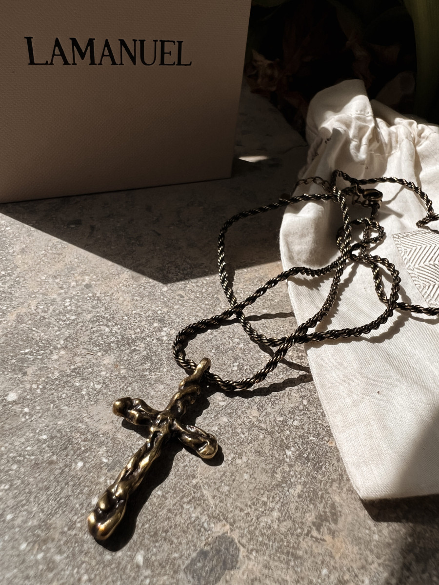 Męski, pozłacany naszyjnik z niestandardowym krzyżem oraz ciekawym łańcuszkiem.
